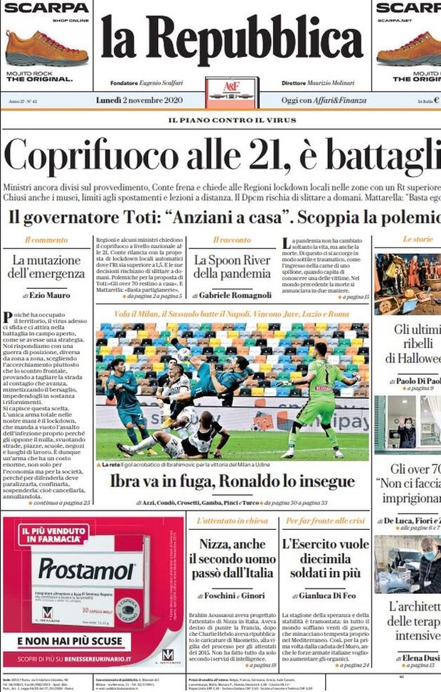 Apre così la prima pagina dell'edizione odierna de "La Repubblica-Palermo", oggi in edicola. “Il piano contro il virus”; “Il governatore Toti: «Anziani a casa». Scoppia la polemica”; “La mutazione dell’emergenza”; “La Spoon River della pandemia”; “Gli over 70 «Non ci facciamo imprigionare»”; “L’architetto delle terapie intensive”; “Gli ultimi ribelli di Halloween”; “Nizza, anche il secondo uomo passò dall’Italia”; “L’esercito vuole diecimila soldati in più”; Spazio al calcio e alla Serie A, “Ibra va in fuga, Ronaldo lo insegue”