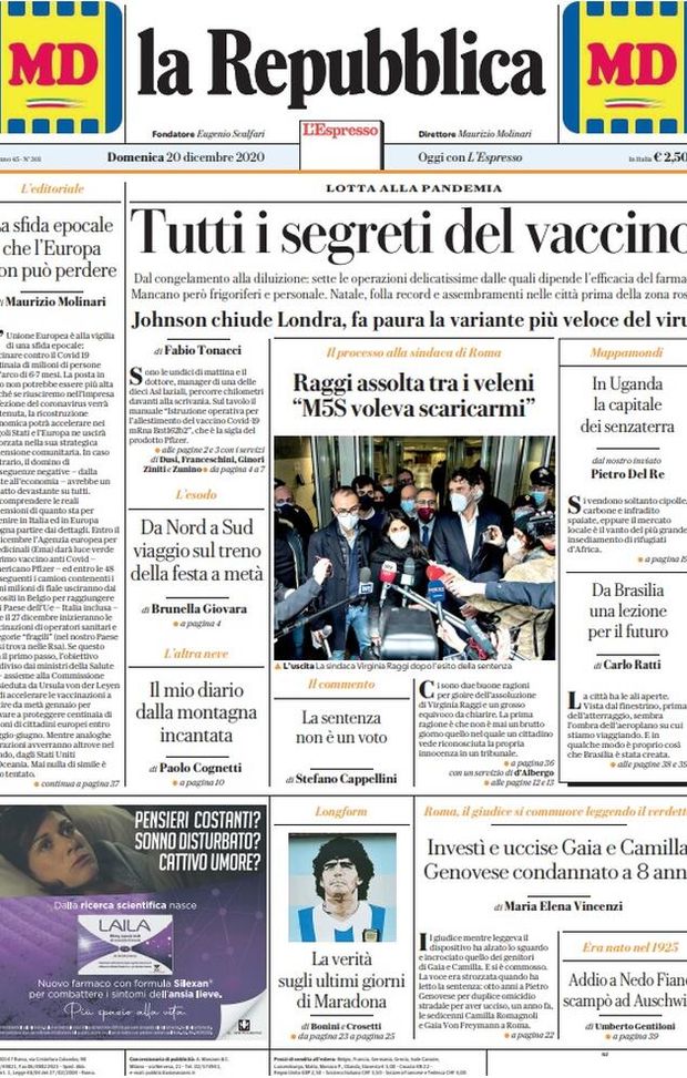 Prima Pagina, La Repubblica: “Covid, tutti i segreti del vaccino. La sfida epocale che l’Europa non può perdere”
