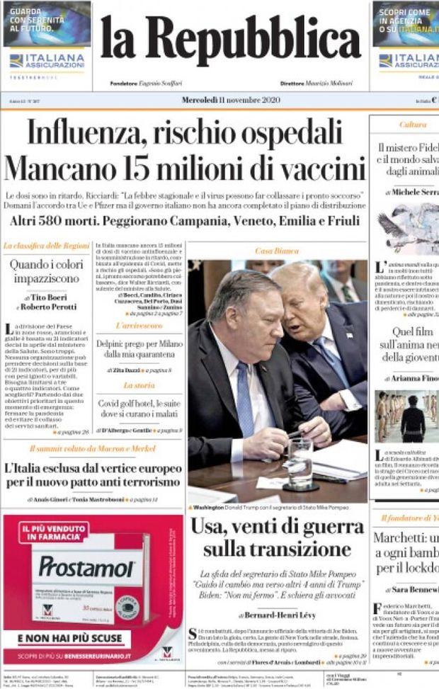 Prima Pagina, La Repubblica: “Influenza, rischio ospedali. Mancano 15 milioni di vaccini”