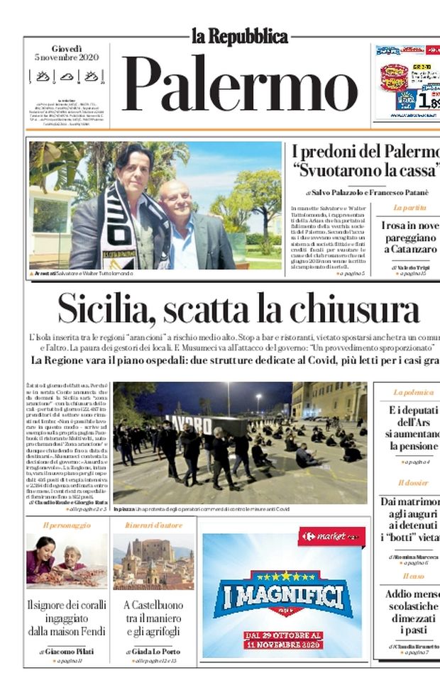 Prima Pagina, La Repubblica – Palermo: “Sicilia, scatta la chiusura. I rosa in nove pareggiano a Catanzaro”