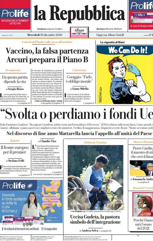 Prima Pagina, La Repubblica: “Vaccino, falsa partenza: ritardi in Italia. L’appello di Mattarella…”