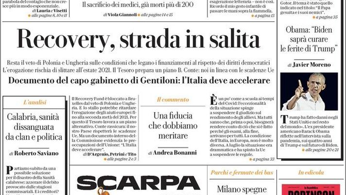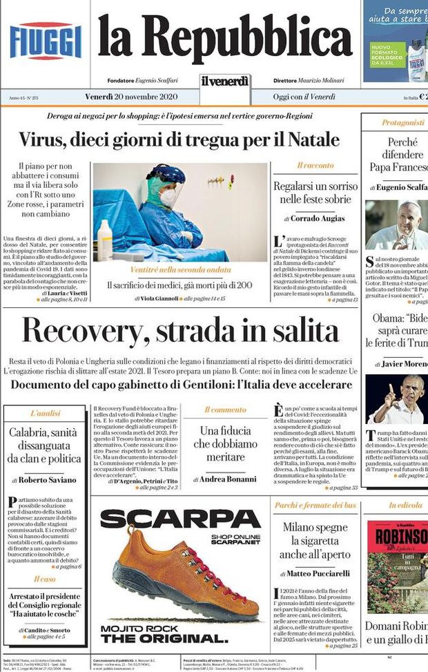 Prima Pagina, La Repubblica: “ Virus, dieci giorni di tregua per il Natale! Recovery, strada in salita”