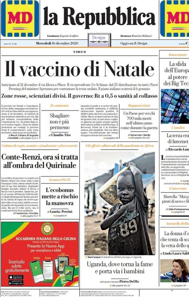 Prima Pagina, La Repubblica: “Zone rosse, scienziati divisi e vaccino di Natale: adesso vietato sbagliare”