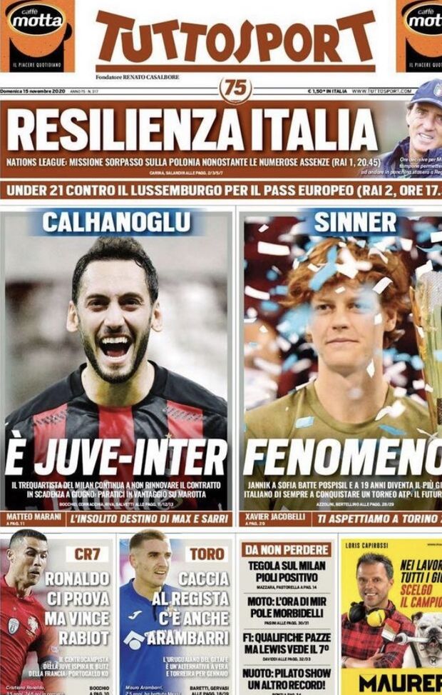 Prima Pagina, Tuttosport: “Calhanoglu, è Juve-Inter. Resilienza Italia”