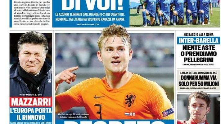 "La Juve è pronta ad annunciare l'acquisto dell'olandese e di Rabiot. Vi spieghiamo come il provvedimento del governo (diventato legge) faciliterà la doppia operazione. Fieri di voi! Le Azzurre eliminate dall'Olanda (0-2) nei quarti del Mondiale, ma l'Italia ha scoperto ragazza da amare. Inter-Barella, niente aste o prendiamo Pellegrini: messaggio alla Roma. Donnarumma via solo per 50 milioni: il Milan detta le condizioni al PSG. Mazzarri, l'Europa porta il rinnovo. Cairo deciso ad allungare il contratto all'allenatore. Scatto Toro per Verdi".
