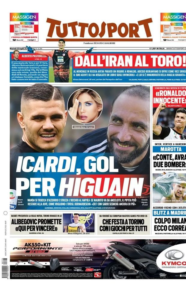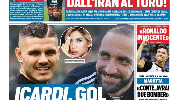 "Wanda si trucca d'azzurro e strizza l'occhio al Napoli: se Maurito va da Ancelotti, il Pipita può restare alla Juve, come vogliono i tifosi. Bernardeschi: 'CR7 con Sarri segnerà ancora di più'. Dall'Iran al Toro! Al Mondiale in Russia aveva parato un rigore a Ronaldo, adesso Beiranvand si offre come vice Sirigu. Il suo agente gli ha regalato un libro sugli Invincibili: 'E lui si è innamorato della maglia granata'. 'Ronaldo innocente', scagionato dall'accusa di stupro. Marotta: 'Conte, avrai due bomber'. Inter, vertice a Nanchino. Colpo Milan, ecco Correa: blitz a Madrid, accordo vicino con l'Atletico".