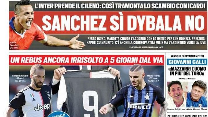 "Un rebus ancora irrisolto a 5 giorni dal via. Gonzalo sempre più vicino alla conferma, Paratici tratta Mandzukic con il Bayern. Sarri torna in campo: sabato a Parma sicuri CR7, Douglas Costa e Khedira. Rugani va verso la Roma. Sanchez sì, Dybala no. L'Inter prende il cileno: così tramonta lo scambio con Icardi. Perso Dzeko, Marotta chiude l'accordo con lo United per l'ex Udinese. Pressing Napoli su Maurito: c'è anche la contropartita Milik ma l'argentino vuole la Juve. Giovanni Galli, verso il Wolverhampton: 'Mazzarri l'uomo in più del Toro'. Balotelli: 'Finalmente gioco nella mia Brescia'. Cellino euforico: che colpo! Bologna, che tris al Pisa! 'E' per Mihajlovic'. Coppa Italia, Corini va ko".