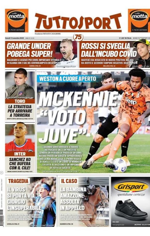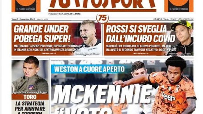 La prima pagina dell’edizione odierna di “Tuttosport” apre con le dichiarazioni rilasciate da Mckennie. “Weston a cuore aperto. ‘Quando sono arrivato a Torino ho pensato: ok è un prestito, sembra un periodo di prova di un anno, ma ora provo senso di appartenenza. Ho la mia nuova casa, il primo regalo di Agnelli è stato un libro su Mandela. La lotta al razzismo è un impegno di tutta la società’. Toro, la strategia per arrivare a Torreira. Inter, Sanchez ko. Che bufera con il Cile”. In taglio alto: “Grande Under, Pobega super! Malgrado le assenze per Covid, importante vittoria in Islanda con 2 gol del centrocampista dello Spezia”. Infine, in taglio basso: “Tragedia: il virus si porta via Giorgio L’Insuperabile”.