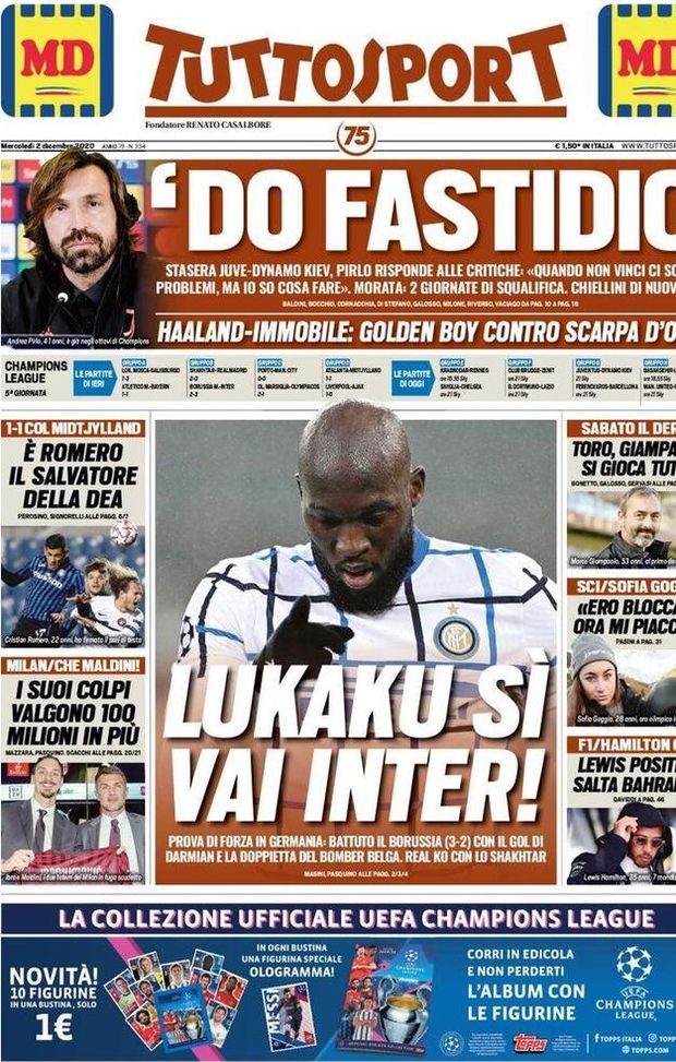 Prima Pagina, Tuttosport: “Stasera Juve-Dynamo Kiev, l’inter asfalta il Borussia. Haaland-Immobile…”