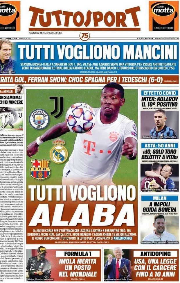 Mediagol.it vi propone la prima pagina di “Tuttosport" oggi in edicola. “Tutti vogliono Mancini! Stasera Bosnia-Italia a Sarajevo”, “Morata Gol, Ferran show: choc Spagna per i tedeschi (6-0)”, “Tutti vogliono Alaba”, “Inter: Kolarov, il 10° positivo”, “A Napoli guida Bonera”.