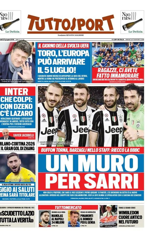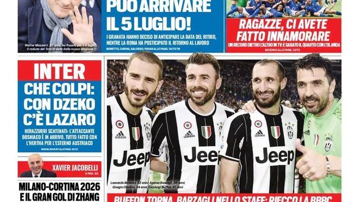"Buffon torna, Barzagli nello staff: riecco la BBBC. Non solo il portiere, che sarà il vice Szczęsny e potrà giocare 15 partite. L'ex difensore ha detto sì al nuovo allenatore: entrerà nel gruppo dei suoi collaboratori. Così la Juve blinda lo spogliatoio con il carisma dei senatori. Toro, l'Europa può arrivare il 5 luglio! Il giorno della svolta Uefa. I granata hanno deciso di anticipare la data del ritiro, mentre la Roma ha posticipato il ritorno al lavoro. Ragazze, ci avete fatto innamorare. Un record dietro l'altro in tv: e sabato il quarto con l'Olanda. Inter, che colpi: con Dzeko c'è Lazaro. Nerazzurri scatenati: l'attaccante bosniaco è in arrivo, tutto fatto con l'Hertha per l'esterno austriaco. Gigio ai saluti, Reina sarà titolare. Il Milan attende l'offerta giusta del PSG. Manolas al Napoli: 34 milioni. Diawara alla Roma. Pinamonti il bomber per il Genoa: regalo ad Andreazzoli".