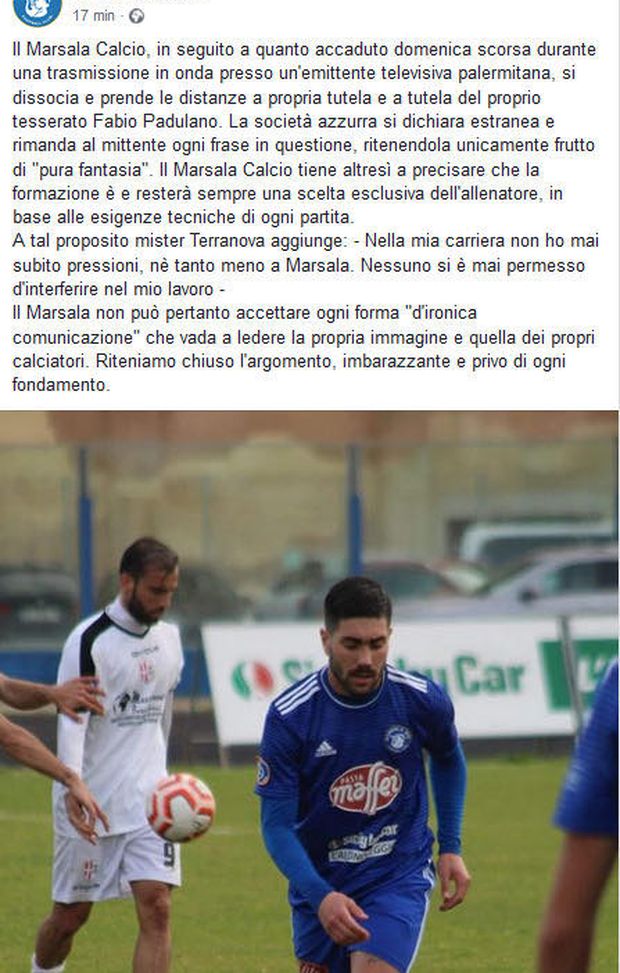 Sulla vicenda si è espresso anche il Marsala, prendendo le distanze dall'accaduto attraverso una nota ufficiale pubblicata sulla propria pagina 'Facebook': "Il Marsala Calcio, in seguito a quanto accaduto domenica scorsa durante una trasmissione in onda presso un'emittente televisiva palermitana, si dissocia e prende le distanze a propria tutela e a tutela del proprio tesserato Fabio Padulano. La società azzurra si dichiara estranea e rimanda al mittente ogni frase in questione, ritenendola unicamente frutto di "pura fantasia". Il Marsala Calcio tiene altresì a precisare che la formazione è e resterà sempre una scelta esclusiva dell'allenatore, in base alle esigenze tecniche di ogni partita. A tal proposito mister Terranova aggiunge: - Nella mia carriera non ho mai subito pressioni, nè tanto meno a Marsala. Nessuno si è mai permesso d'interferire nel mio lavoro - Il Marsala non può pertanto accettare ogni forma "d'ironica comunicazione" che vada a ledere la propria immagine e quella dei propri calciatori. Riteniamo chiuso l'argomento, imbarazzante e privo di ogni fondamento", si legge.