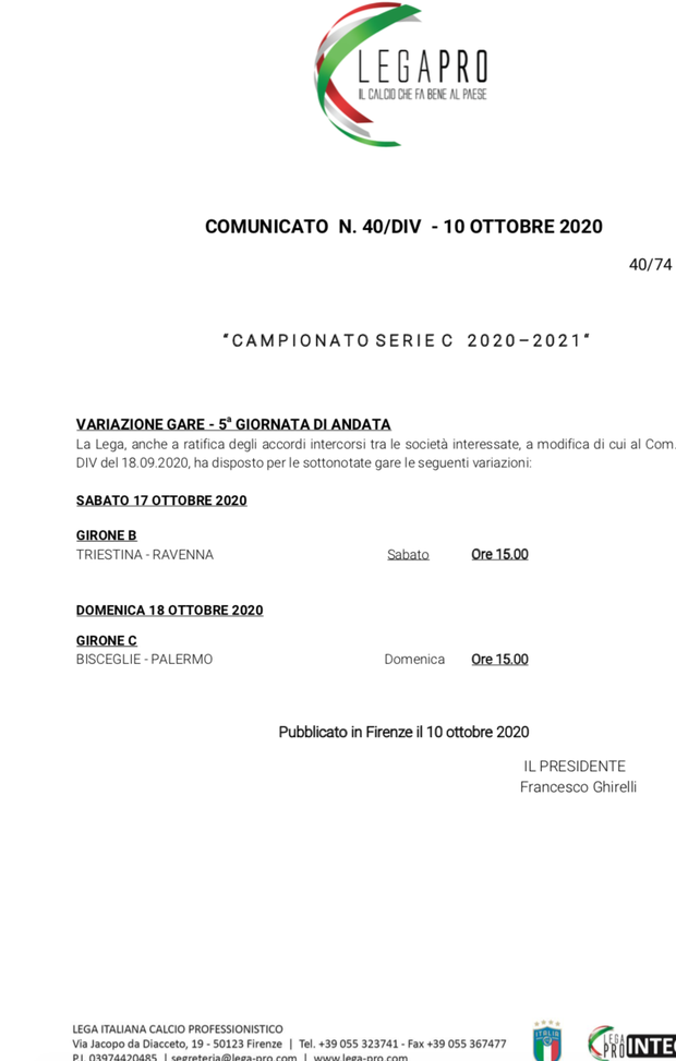 Serie C, cambia l’orario di Bisceglie-Palermo in programma domenica 18 ottobre: il comunicato