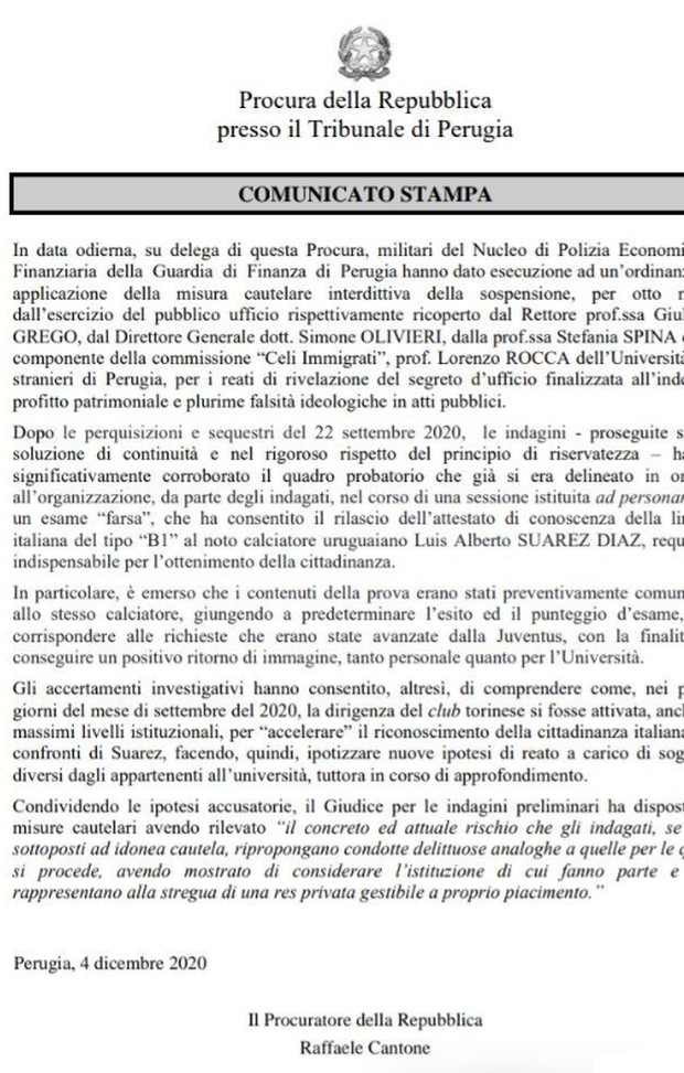 Dopo le perquisizioni ed i sequestri del 22 settembre 2020, le indagini - proseguite incessantemente, senza soluzione di continuità e nel rigoroso rispetto del principio di riservatezza - hanno significativamente confermato quanto segue: "Il quadro probatorio che già si era delineato in ordine all’organizzazione, da parte degli indagati, nel corso di una sessione istituita ad personam, di un esame “farsa” - si legge nella nota - che ha consentito il rilascio dell’attestato di conoscenza della lingua italiana del tipo “B1” al calciatore uruguaiano, requisito indispensabile per l’ottenimento della cittadinanza" - questo è quanto emerso dalle indagini guidate dal Procuratore della Repubblica Raffaele Cantone.