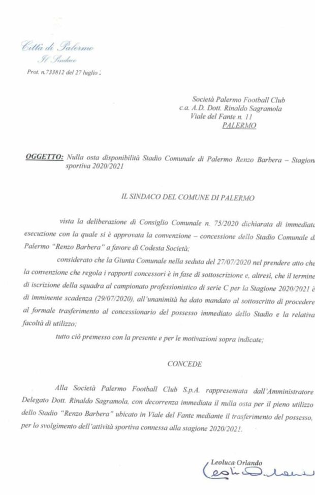 Nella giornata odierna la Giunta Comunale di Palermo ha preso atto della delibera del Consiglio comunale, approvando all'unanimità la convenzione grazie alla quale il Palermo F.C. avrà la certezza di giocare le gare casalinghe sul prato dello stadio Renzo Barbera. Il sindaco Leoluca Orlando ha firmato la lettera con cui ha affidato l'impianto di Viale del Fante alla società rosanero per la stagione 2020/2021. Nei prossimi giorni, come affermato dal primo cittadino in persona, verrà firmato il contratto di concessione della durata di sei anni. Questa la lettera in questione: