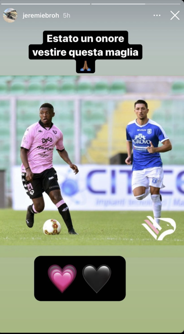 Queste le parole di Jeremie Broh, ormai ex mezzala del Palermo trasferitosi nelle ultime ore al SudTirol. Finito tra gli esuberi della rosa di Giacomo Fiippi, l'ex Sassuolo non è stato riconfermato nella rosa che affronterà la stagione 21/22, passando alla formazione altoatesina a titolo temporaneo. Il centrocampista di origine ivoriana ha quindi voluto salutare Palermo e il Palermo con una stories pubblicata sul suo profilo Instagram, nella quale ha omaggiato - con una sua foto sul campo - il privilegio da lui avuto nel vestire la maglia rosanero.