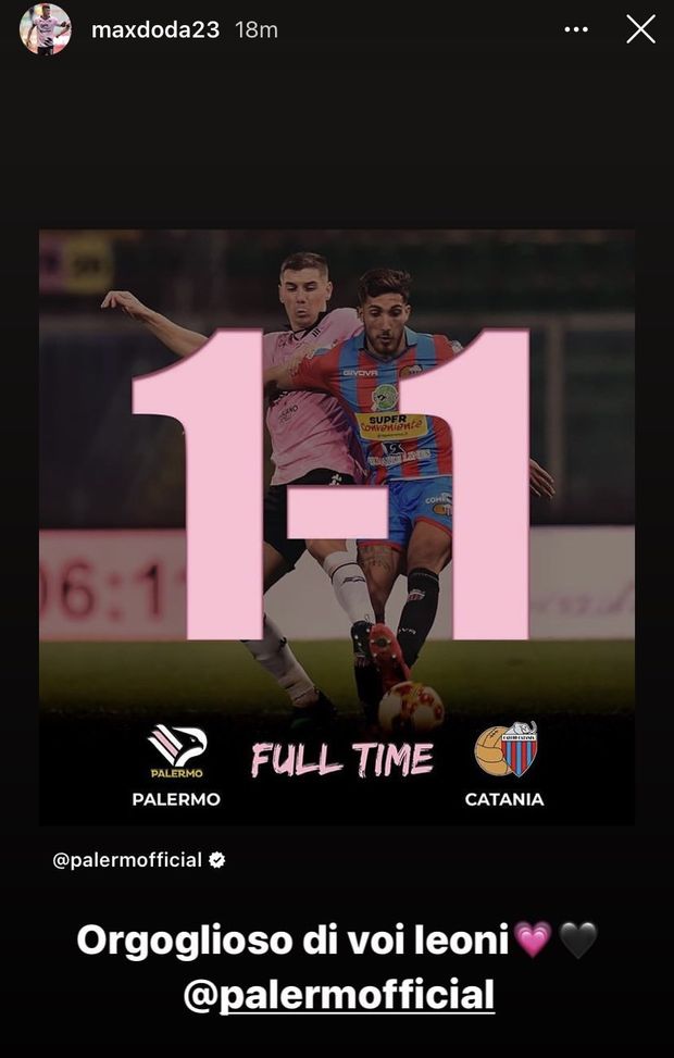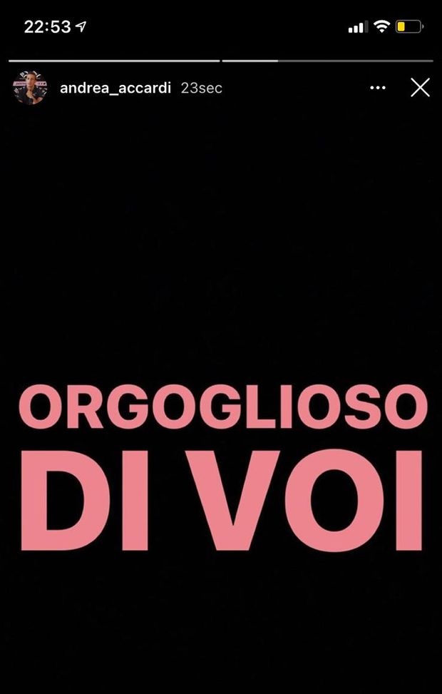 "Orgoglioso di voi", ha scritto il difensore del Palermo, Andrea Accardi, sul proprio account Instagram dopo il triplice fischio. Il classe 1995 è stato costretto al forfait dopo essere risultato nuovamente positivo al Covid-19 a poche ore dal match.