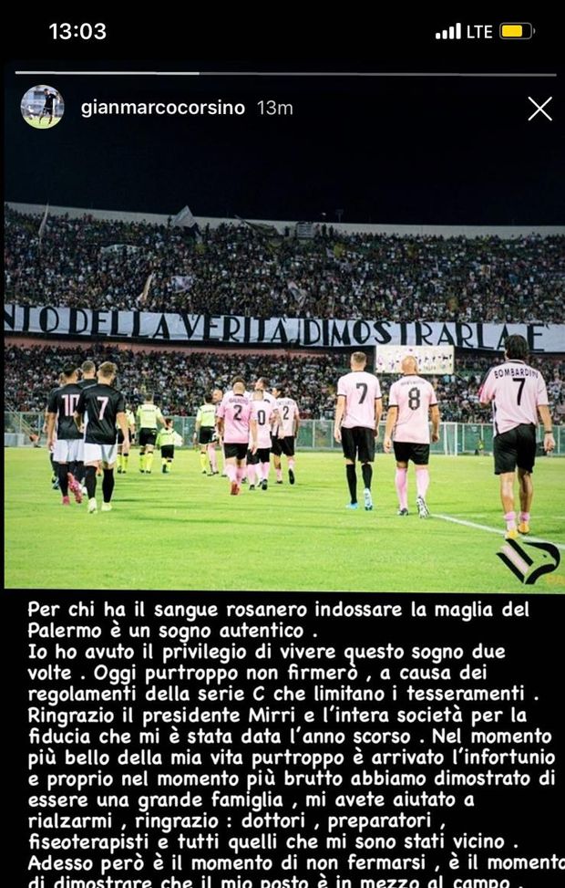 "Per chi ha il sangue rosanero indossare la maglia del Palermo è un sogno autentico. Io ho avuto il privilegio di vivere questo sogno due volte. Oggi purtroppo non firmerò a causa dei regolamenti della Serie C che limitano i tesseramenti - ha scritto Corsino attraverso il proprio account Instagram -. Ringrazio il presidente Mirri e l'intera società per la fiducia che mi è stata data l'anno scorso. Nel momento più bello della mia vita purtroppo è arrivato l'infortunio. E proprio nel momento più brutto abbiamo dimostrato di essere una grande famiglia. Mi avete aiutato a rialzarmi. Ringrazio dottori, preparatori, fisioterapisti e tutti quelli che mi sono stati vicino. Adesso però è il momento di non fermarsi, è il momento di dimostrare che il mio posto è in mezzo al campo. Grazie a chi ha il Palermo nel cuore, a chi lavora dietro le quinte che è più importante di noi calciatori, ed infine ai tifosi che mi hanno dimostrato giornalmente di quanto sia immensamente meraviglioso essere figlio di questa città e di questi splendidi colori. Grazie di vero cuore".