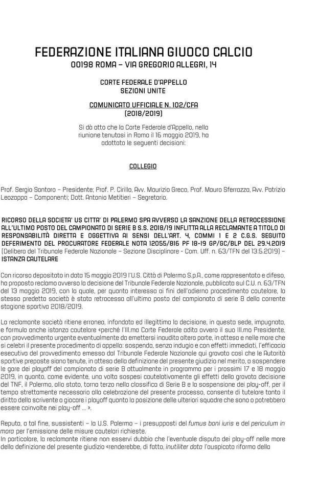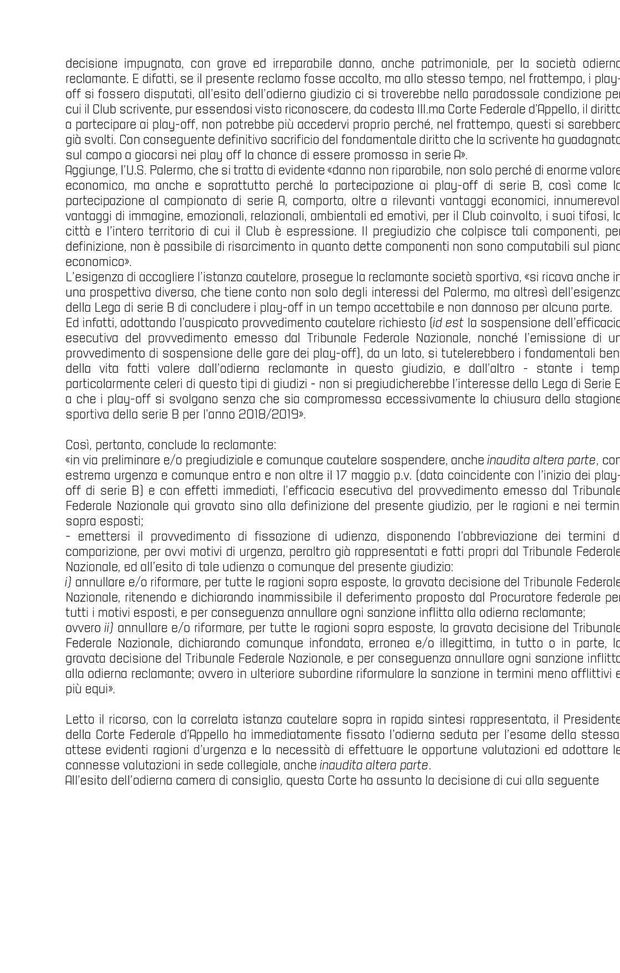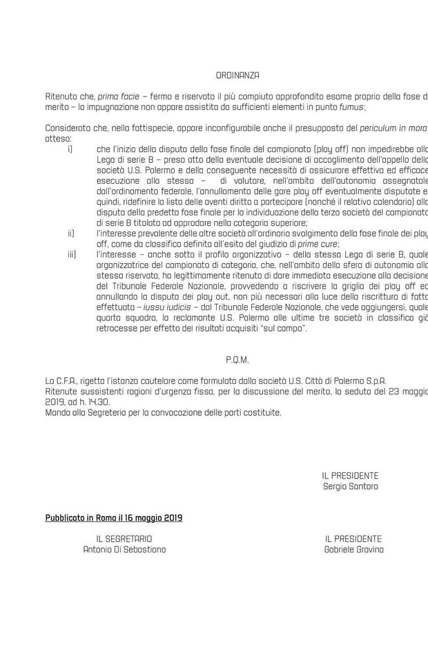 "La Corte Federale d’Appello rigetta l’istanza cautelare formulata dalla società U.S. Città di Palermo S.p.A., in relazione alla sospensione delle gare dei playoff del campionato di Serie B attualmente in programma per i prossimi 17 e 18 maggio 2019 e, ritenute sussistenti ragioni d’urgenza, fissa per la discussione del merito la seduta del 23 maggio 2019, alle ore 14.30.