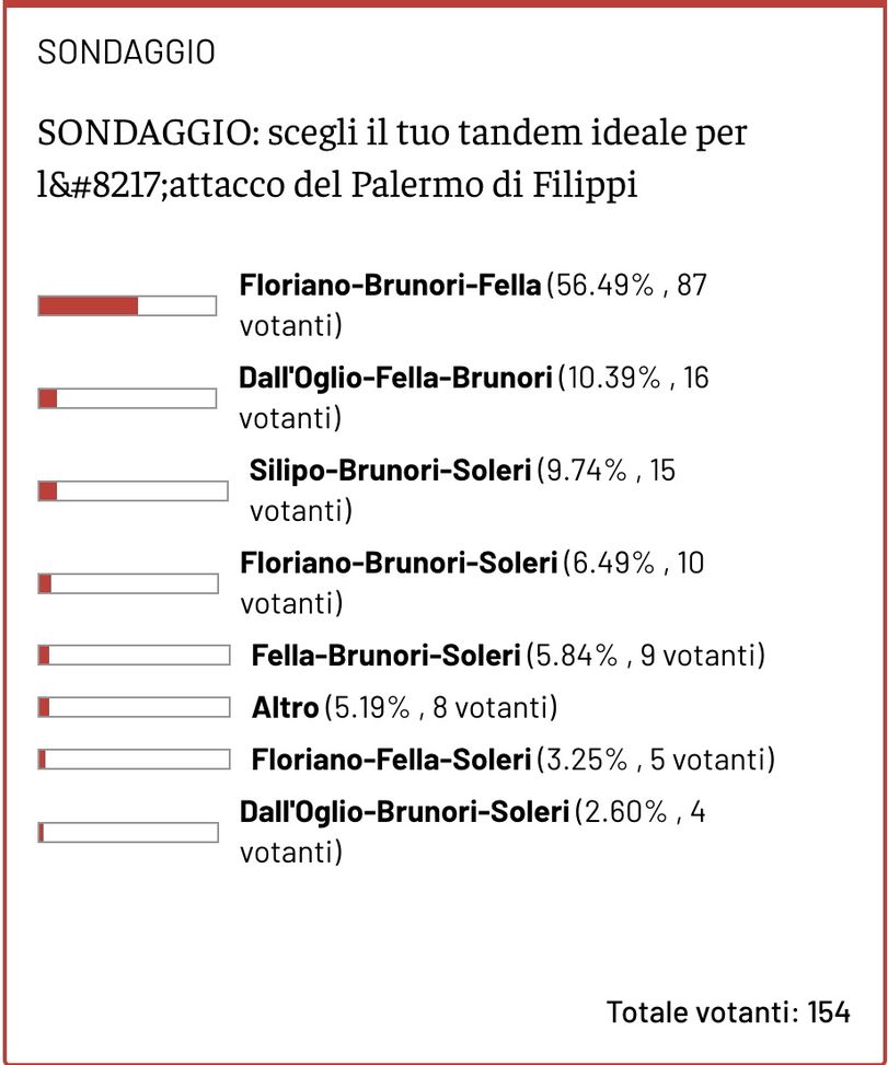 Ai nastri di partenza il Girone C di Serie C. Il Palermo si presenta alla griglia d'inizio stagione con un pacchetto offensivo quasi totalmente rinnovato rispetto alla scorsa annata agonistica. Confermati i jolly offensivi Roberto Floriano ed Andrea Silipo, perfezionato il reparto con gli innesti di Edoardo Soleri, Giuseppe Fella e Matteo Brunori. Il risultato di un precedente sondaggio effettuato dalla redazione di Mediagol.it ha reso nota la preferenza dei supporters rosanero per il modulo 3-4-1-2 rispetto al 3-4-2-1. Ecco, dunque, chi dovrebbero essere gli interpreti dell'asset offensivo del Palermo di Giacomo Filippi secondo gli utenti di Mediagol.it.