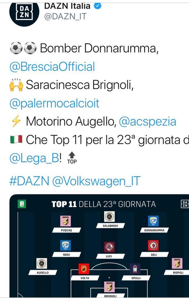 Un grande attestato di stima per i rosanero, attualmente impegnati a preparare il delicatissimo scontro diretto contro il Brescia di Eugenio Corini, in programma venerdì 15 febbraio alle ore 21:00 allo stadio “Renzo Barbera”, dove è previsto un ritorno in massa della tifoseria. Premiate anche le Rondinelle, che nella top 11 vanta la presenza del centrocampista Emanuele Ndoj e del capocannoniere Alfredo Donnarumma.