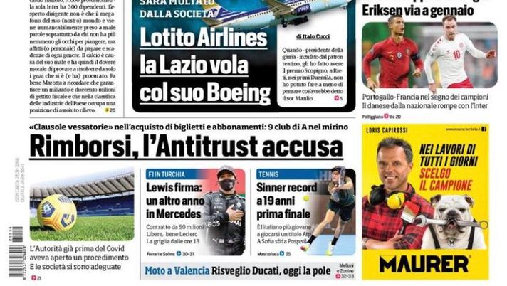 Apre così la prima pagina dell’edizione odierna de “Il Corriere dello Sport”. Luis Alberto polemico: sarà multato dalla società: Lotito Airlines, la Lazio vola col suo Boeing. In taglio basso: "RIMBORSI, L'ANTITRUST ACCUSA". 'Clausole vessatorie nell'acquisto di biglietti e abbonamenti, 9 club di A nel mirino'.