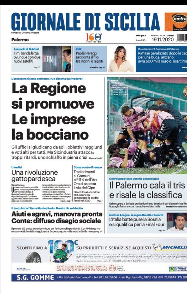 Apre così la prima pagina dell’edizione odierna del ‘Giornale di Sicilia’. “Gli uffici si giudicano da soli: obiettivi raggiunti e voti alti a tutti. Ma Sicindustria attacca: troppi ritardi, uno schiaffo in piena crisi. Trasferimenti ai comuni, c’è il sì dell’Ars. Ora si aspetta il via del Cipe. Gli enti locali attendono 263 milioni per compensare le perdite fiscali nel 2020. Aiuti e sgravi: manovra pronta. Conte: diffuso disagio sociale”. Poi, riflettori puntati sulle vittorie di Palermo e Italia. “Il Palermo cala il tris e risale in classifica. Nel recupero al Barbera partita dominata, decisivo il gol di Luperini nel finale. Boscaglia frena: ancora non abbiamo fatto nulla. L’Italia batte pure la Bosnia e ai qualifica per le Final Four”. Infine, in taglio alto: “Tim: banda larga ovunque con due nuovi satelliti. Paola Perego racconta il filo tra nonni e nipoti. Rimase paralizzato dopo la caduta per una buca: anziano avrà 600 mila euro di risarcimento”.