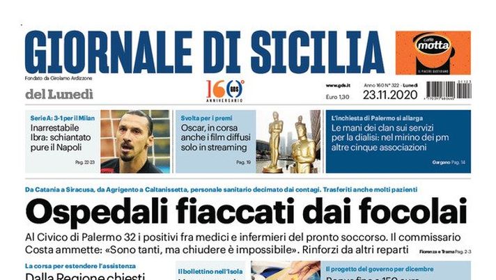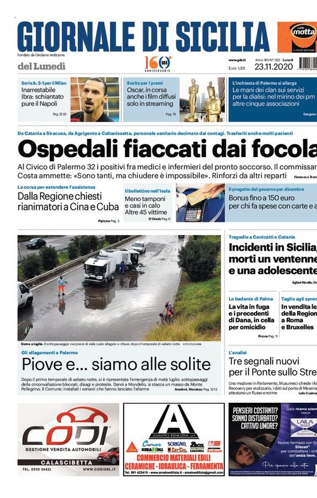 Apre così la prima pagina dell’edizione odierna del ‘Giornale di Sicilia’. “Al Civico di Palermo 32 i positivi fra medici e infermieri del pronto soccorso. Il commissario Costa ammette: ‘Sono tanti, ma chiudere è impossibile’. Rinforzi da altri reparti. Da Catania a Siracusa, da Agrigento a Caltanissetta, personale sanitario decimato dai contagi. Trasferiti anche molti pazienti. Dalle Regioni chiesti rianimatori da Cina e Cuba. Meno tamponi e casi in calo. Altre 45 vittime. Bonus fino a 150 euro per chi fa spese con carte e app. Incidenti in Sicilia, morti un ventenne e una adolescente. La badante di Palma: la vita in fuga e i precedenti di Dana, in cella per omicidio. In vendita le sedi della Regione a Roma e Bruxelles”. E ancora: “Piove e... siamo alle solite. Dopo il primo temporale di sabato notte, si è ripresentata l’emergenza di metà luglio: sottopassaggi della circonvallazione bloccati, disagi e proteste. Danni a Mondello, si stacca un masso da Monte Pellegrino. Il Comune: installati i sensori che hanno lanciato l’allarme. Tre segnali nuovi per il Ponte sullo Stretto”. Infine, in taglio alto; “Inarrestabile Ibra: schiantato pure il Napoli. Oscar, in corsa anche i film diffusi solo in streaming. Le mani dei clan sui servizi per la dialisi: nel mirino dei pm altre cinque associazioni”.