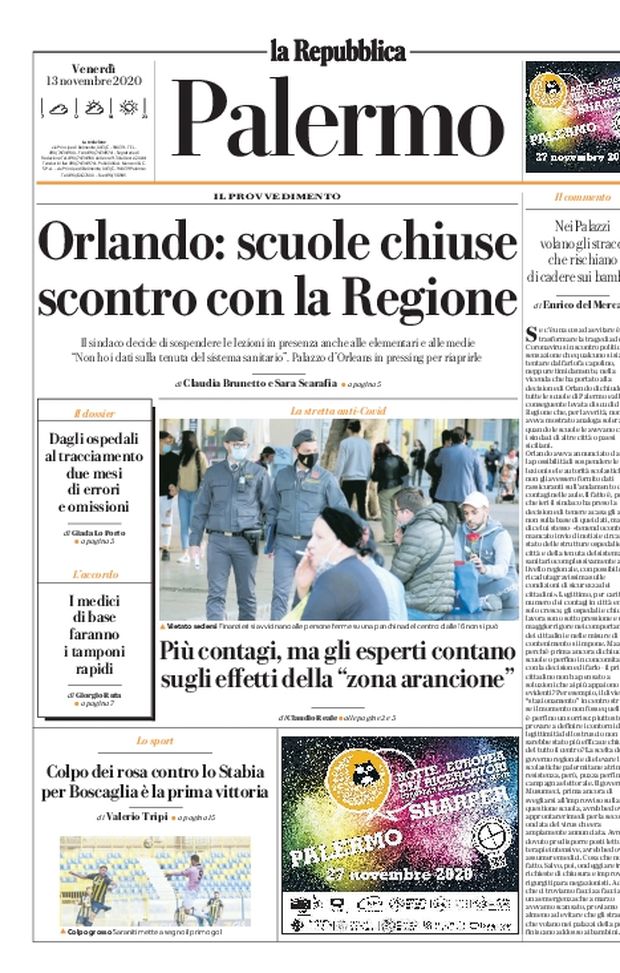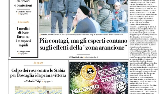 Apre così la prima pagina dell’edizione odierna de “La Repubblica - Palermo”. “Dagli ospedali a tracciamento, due mesi di errori e omissioni. I medici di base faranno i tamponi rapidi. Più contagi ma gli esperti contano sugli effetti della zona arancione”. Poi, riflettori puntati sulla sfida andata in scena ieri pomeriggio allo Stadio “Romeo Menti”. “Colpo dei rosa contro lo Stabia, per Boscaglia è la prima vittoria”.