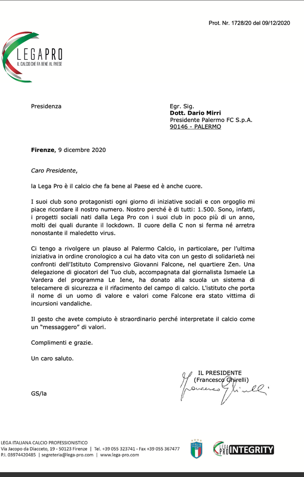 Il presidente della Lega Pro ha ricordato con grande orgoglio l'iniziativa messa in piedi dal club rosanero che nelle scorse settimane si è impegnato con grande dedizione nel sociale. I rosanero, infatti, hanno contribuito al rifacimento di un campo da calcio situato nei pressi dell'Istituto Comprensivo Giovanni Falcone del quartiere Zen oltre ad avere donato alla stessa scuola un sistema di telecamere di sicurezza. Ghirelli si è soffermato proprio sul progetto portato avanti dal Palermo e attraverso un comunicato ufficiale si è complimentato con l'intero club di Viale del Fante.