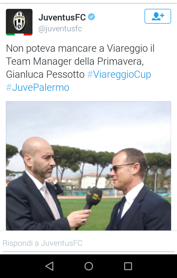 Pubblico delle grandi occasioni per Juventus-Palermo, match che decreterà la squadra vincitrice della 68esima edizione della Viareggio Cup. Ad assistere al match, che si disputerà a partire dalle ore 15 (qui le formazioni ufficiali) ci sarà anche Gianluca Pessotto, bandiera della Juventus e team manager dell'attuale primavera bianconera. Di seguito, Mediagol.it vi propone la foto raffigurante l'ex calciatore, pubblicata tramite il profilo Twitter ufficiale della società piemontese: