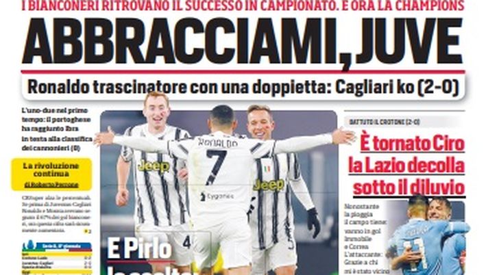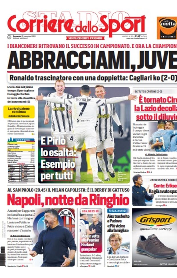 Apre così la prima pagina dell’edizione odierna del ‘Corriere dello Sport’. "I bianconeri ritrovano il successo in campionato. E ora la Champions. Ronaldo trascinatore con una doppietta: Cagliari ko (2-0). E Pirlo lo esalta: Esempio per tutti". In taglio basso: "Napoli, notte da Ringhio. Azzurri per l'aggancio in classifica a quota 17. Mertens con Insigne, Lozano e Politano, Rebic insieme a Zlatan rossoneri d'assalto".