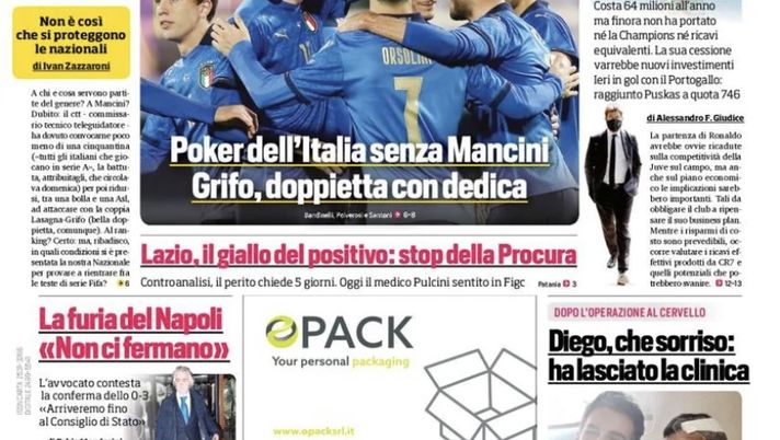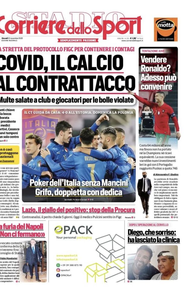 Apre così la prima pagina dell’edizione odierna del ‘Corriere dello Sport’, oggi in edicola. “Multe salate a club e giocatori per le bolle violate. La stretta del protocollo FIGC per contenere i contagi. I punti chiave della bozza elaborata dal presidente dei medici sportivi, Casasco. I nuovi tamponi in un solo centro. Poker dell’Italia senza Mancini. Grifo, doppietta con dedica. Vendere Ronaldo? Adesso può convenire. Costa 64 milioni all’anno ma finora non ha portato né la Champions, né ricavi in equivalenti. La sua cessione varrebbe nuovi investimenti. Ieri in gol con il Portogallo: raggiunto Puskas a quota 746”. E ancora: “Lazio, il giallo del positivo: stop della Procura. La furia del Napoli: ‘Non ci fermiamo’. L’avvocato contesta la conferma dello 0-3. ‘Arriveremo fino al Consiglio di Stato’. Diego, che sorriso. Ha lasciato la clinica”.