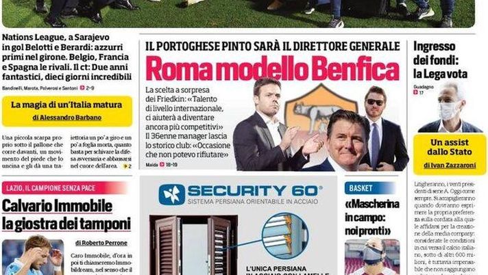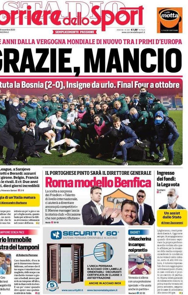 Apre così la prima pagina dell’edizione odierna del ‘Corriere dello Sport’. “A tre anni dalla vergogna mondiale di nuovo tra i primi d’Europa. Battuta la Bosnia, Insigne da urlo. Final Four a ottobre. Nations League, a Sarajevo in gol Belotti e Berardi: azzurri primi nel girone. Belgio, Francia e Spagna le rivali. Il ct: Due anni fantastici, dieci giorni incredibili”. E ancora: “Roma modello Benfica. Il portoghese Pinto sarà il direttore generale. Calvario Immobile, la giostra dei tamponi”.