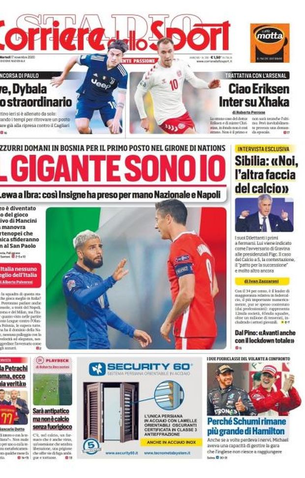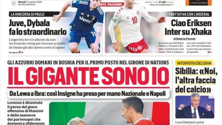Apre così la prima pagina dell'edizione odierna del 'Corriere dello Sport', oggi in edicola. "Gli azzurri domani in Bosnia per il primo posto nel girone di Nations. Da Lewa a Ibra: così Insigne ha preso per mano Nazionale e Napoli. Lorenzo è diventato il perno del gioco offensivo di Mancini e della manovra dei partenopei che domenica sfideranno il Milan al San Paolo". In taglio alto: "Juve, Dybala fa lo straordinario. L'argentino ieri si è allenato da solo: sta forzando i tempi per ritrovare un posto da titolare già alla ripresa contro il Cagliari. Ciao Eriksen, Inter su Xhaka: trattativa con l'Arsenal". Poi, l'intervista esclusiva a Sibilia: "Noi l'altra faccia del calcio". E ancora: "I suoi Dilettanti i primi a fermarsi. Lui viene indicato come l'avversario di Gravina alle presidenziali Figc. Il caso del Calcio a 5, la contestazione, il 'patto per la successione' e molto altro ancora". Infine, le parole di Petrachi: "Roma, ecco la mia verità".