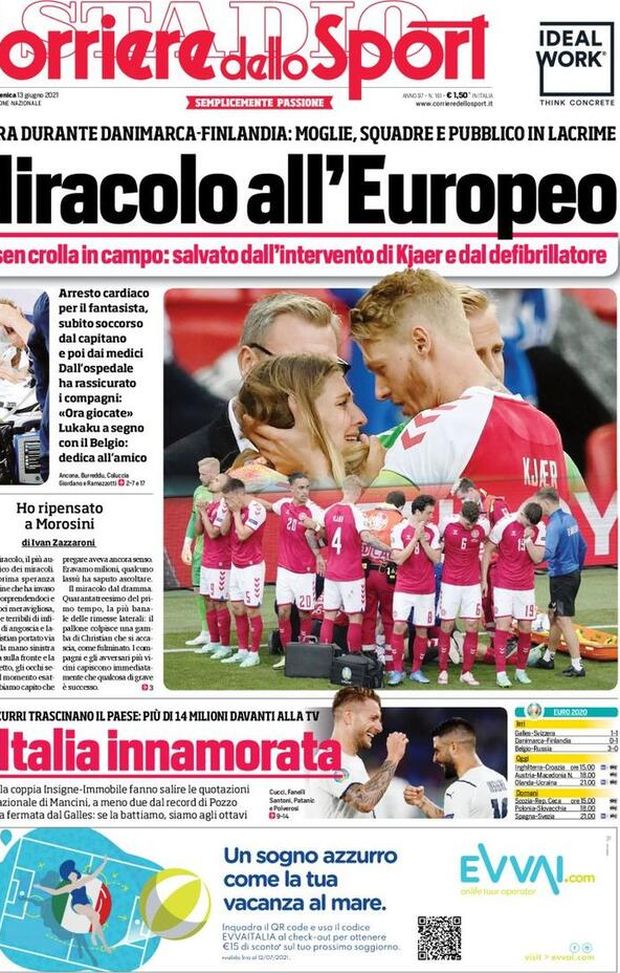 Apre così la prima pagina del "Corriere dello Sport", oggi in edicola. "Eriksen crolla in campo: salvato dall'intervento di Kjaer e dal defibrillatore. Paura durante Danimarca-Finlandia: moglie, squadre e pubblico in lacrime. Arresto cardiaco per il fantasista, subito soccorso dal capitano e poi dai medici. Dall'ospedale ha rassicurato i compagni: 'Ora giocate'. Lukaku a segno con il Belgio: dedica all'amico. L'Italia innamorata. Gli azzurri trascinano il Paese: più di 14 milioni davanti alla tv. I gol della coppia Insigne-Immobile fanno salire le quotazioni della Nazionale di Mancini, a meno due dal record di Pozzo. Svizzera fermata dal Galles: se la battiamo, siamo agli ottavi".
