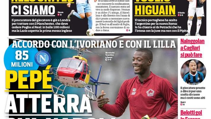 "Accordo con l'ivoriano e con il Lilla: 85 milioni. Colpo di scena a Dimaro, sbarcano in elicottero gli agenti dell'attaccante. Riunione fiume con ADL, nell'affare pure Ounas. E' l'acquisto più caro nella storia della società. Il nodo delle commissioni. Milinkovic allo United: ci siamo. Il procuratore del giocatore è già a Londra per trattare con il Manchester, che deve cedere Pogba al Real: in ballo 100 milioni ma Lazio aspetta la prima mossa inglese. Fonseca: 'Voglio Higuain'. Il tecnico portoghese ha scelto l'argentino per la nuova Roma: lo ha chiesto al ds Petrachi che ha l'intesa con Paratici ma non con il Pipita. Nainggolan a Cagliari si può fare. Il giocatore pronto a dire sì per una scelta di cuore ma i costi sono alti. Belotti gol, in Europa il Toro va. Tris al Debrecen nel preliminare. Ansaldi e Zaza chiudono il conto. De Rossi a Buenos Aires manda in estasi il Boca. Donne professioniste, la promessa è svanita?".