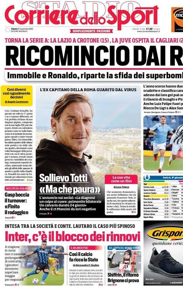Apre così la prima pagina dell’edizione odierna del ‘Corriere dello Sport’. Immobile e Ronaldo: riparte la sfida dei superbomber. L'ex capitano della Roma guarito dal virus. Sollievo Totti: "Ma che paura". In taglio basso: Inter, c'è il blocco dei rinnovi.
