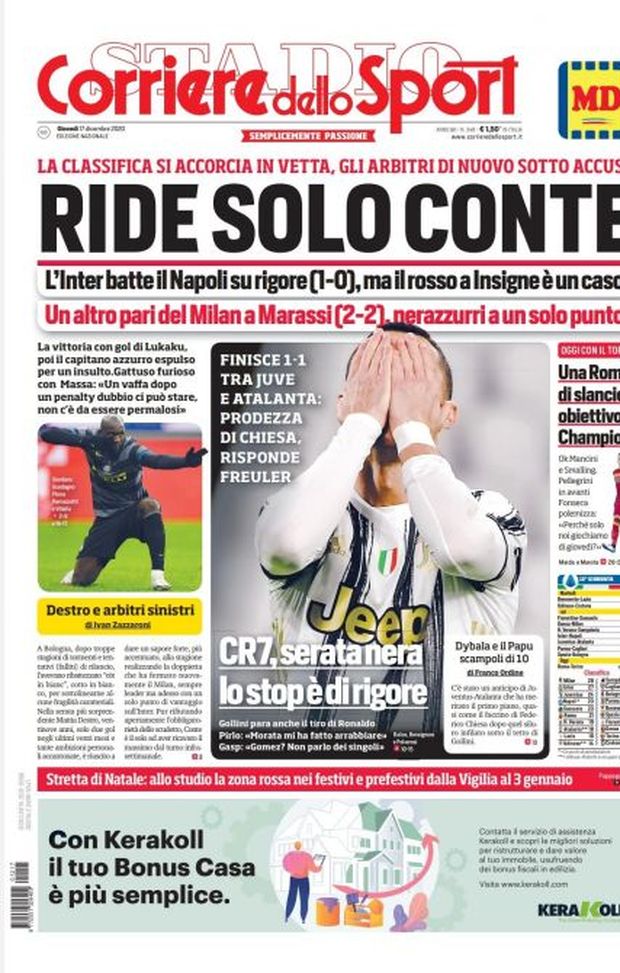 Prima Pagina, Corriere dello Sport: “Ride solo Conte. CR7, serata nera”