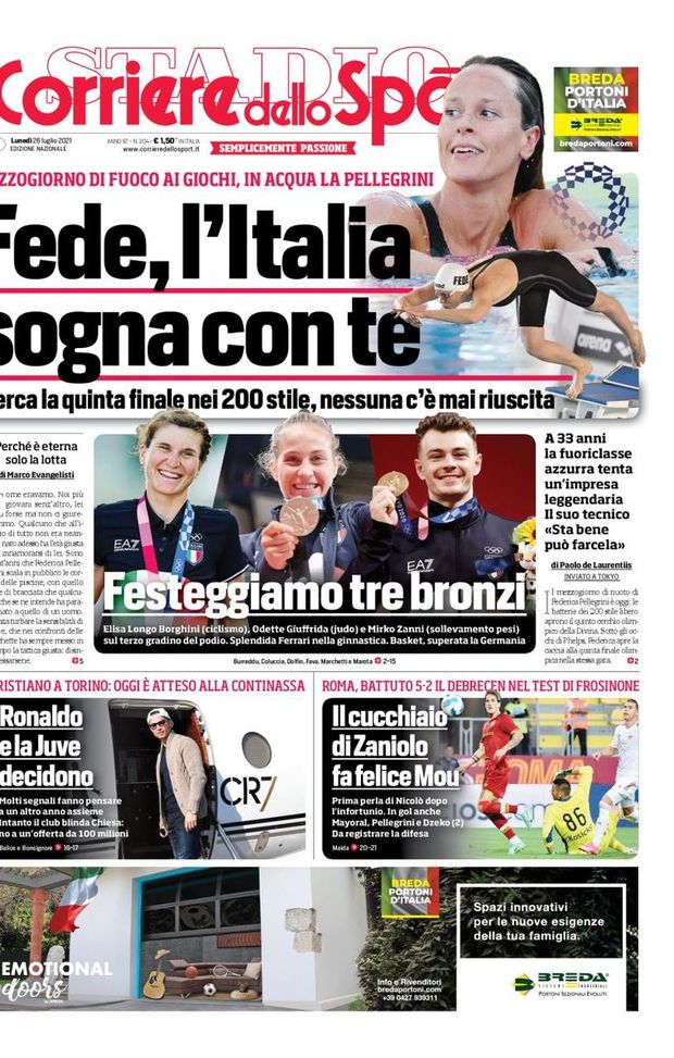 "Fede, l'Italia sogna con te". Apre così la prima pagina del "Corriere dello Sport", oggi in edicola. "Mezzogiorno di fuoco ai giochi, in acqua la Pellegrini. Cerca la quinta finale nei 200 stile, nessuna c'è mai riuscita. Festeggiamo tre bronzi. Ronaldo e la Juve decidono. Cristiano a Torino: oggi è atteso alla Continassa. Molti segnali fanno pensare a un altro anno assieme. Intanto il club blinda Chiesa: no a un'offerta da 100 milioni. Il cucchiaio di Zaniolo fa felice Mou. Roma, battuto 5-2 il Debrecen nel test di Frosinone. Prima perla di Nicolò dopo l'infortunio. In gol anche Mayoral, Pellegrini e Dzeko. Da registrare la difesa".