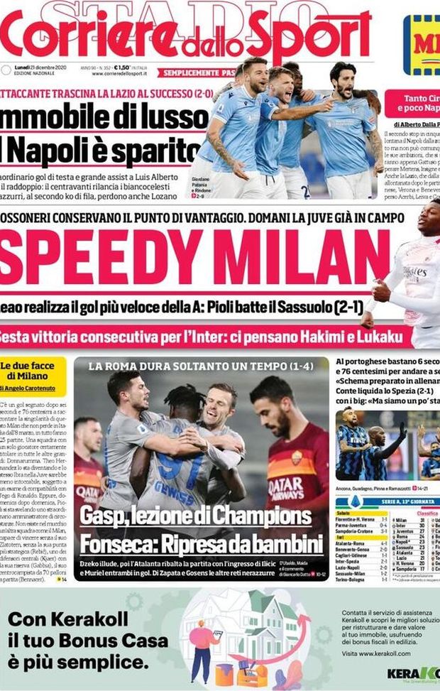 Apre così l'edizione odierna de 'Il Corriere dello Sport'. "I rossoneri conservano il punto di vantaggio. Domani la Juve già in campo. Leao realizza il gol più veloce della A: Pioli batte il Sassuolo (2-1)". E ancora: "Sesta vittoria consecutiva per l'Inter: ci pensano Hakimi e Lukaku".
