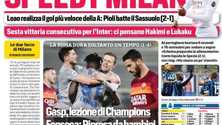 Prima Pagina, Corriere dello Sport: “Speedy Milan! Leao e il gol più veloce della A. Sesta vittoria di fila per l’Inter”