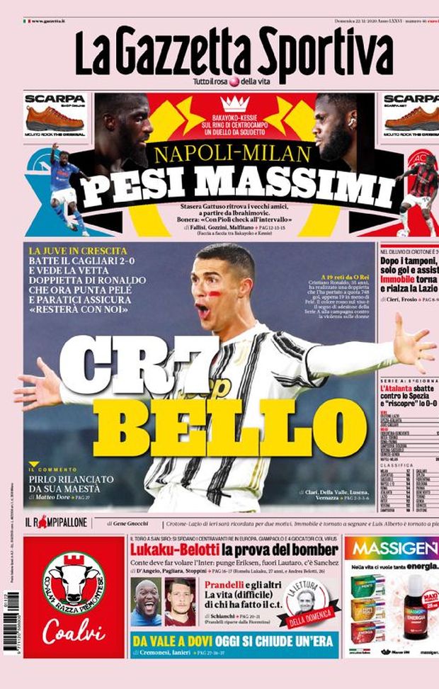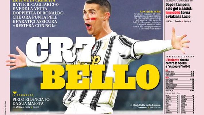 Apre così la prima pagina dell’edizione odierna de 'La Gazzetta dello Sport’. La Juve in crescita batte il Cagliari 2-0 e vede la vetta; doppietta di Ronaldo che ora punta Pelè e Paratici assicura: "Resterà con noi". In taglio alto: Napoli-Milan pesi massimi. In taglio basso: "Lukaku-Belotti la prova dei bomber".