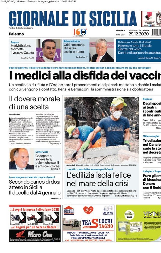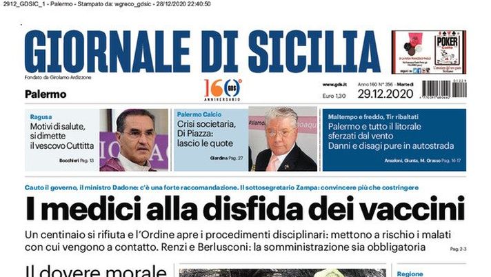 Prima Pagina, Giornale di Sicilia: “I medici alla disfida dei vaccini. Palermo, crisi societaria”