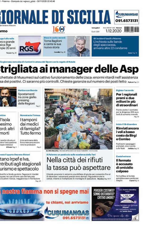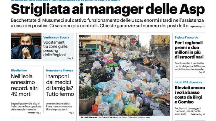 Apre così la prima pagina dell’edizione odierna del ‘Giornale di Sicilia’. “Bacchettate di Musumeci sul cattivo funzionamento delle Usca: enormi ritardi nell’assistenza a casa dei positivi. Ci saranno più controlli. Chieste garanzie sul numero dei posti letto. In Sicilia giornata convulsa di riunioni in attesa del Dpcm con le regole di Natale. Spostamenti tra zone gialle: pressing delle Regioni. Nell’Isola ennesimo record: altri 49 morti. I tamponi dai medici di famiglia? Tutto fermo. Slittano Irpef e Iva, contributi agli stagionali di turismo e spettacolo”. E ancora: “Nella città dei rifiuti la tassa può aspettare. A Palermo un pasticcio sulle scadenze della Tari. Orlando annuncia in extremis una delibera di giunta per consentire fino al 31 dicembre i versamenti previsti entro domani. Riguarderà tutte le utenze. Intanto si moltiplicano le montagne di spazzatura. Per i regionali premi e due milioni in più di straordinari. Rinviati ancora i voli a basso costo da Birgi e Comiso. Inizio il 18 dicembre. Castelvetrano, il fermato è accusato di omicidio colposo”. Infine, in taglio alto: “News e grande musica: Rgs compie 20 anni. Torna Baglioni e canta la sua nuova storia. L’inchiesta sulle bande degli spaccaossa, arrivano altre 22 condanne”.