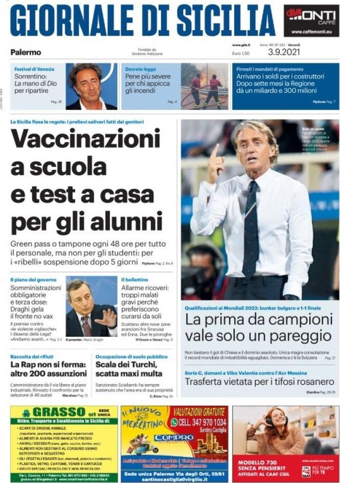 "Vaccinazioni a scuola e test a casa per gli alunni". Titola così la Prima Pagina dell'edizione odierna del noto quotidiano "Giornale di Sicilia". "Green pass o tampone ogni 48 ore per tutto il personale, ma non per gli studenti: per i <<ribelli>> sospensione dopo 5 giorni". E ancora: "Pene più severe per chi appicca incendi. Somministrazioni obbligatorie e terza dose: Draghi gela il fronte no vax. Allarme ricoveri: troppi malati gravi perché preferiscono curarsi da soli. La Rap non si ferma: altre 200 assunzioni". E infine: "La prima da campioni vale solo un pareggio. Trasferta vietata per i tifosi rosanero".