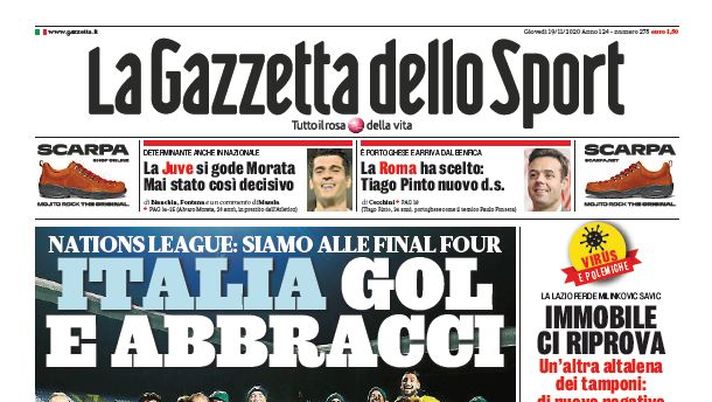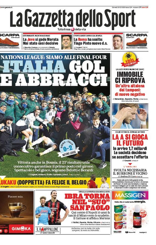 Apre così la prima pagina dell’edizione odierna de ‘La Gazzetta dello Sport’. “Nations League: siamo alle Final Four. Vittoria anche in Bosnia, il 23º risultato utile consecutivo garantisce il primo posto nel girone. Spettacolo e bel gioco, segnano Belotti e Berardi. Lukaku (doppietta) fa felice il Belgio”. E ancora: “Immobile ci riprova. Un’altra altalena dei tamponi: di nuovo negativo. La A si gioca il futuro. In arrivo 1.7 miliardi. Le società decidono se accettare l’offerta. Ibra torna nel ‘suo’ San Paolo. Qui contro il Napoli 10 anni fa lanciò il Milan verso lo scudetto. E Gattuso si affida a Mertens”. Infine, in taglio alto: “La Juve si gode Morata, mai stato così decisivo. La Roma ha scelto, Tiago Pinto nuovo d.s.”.