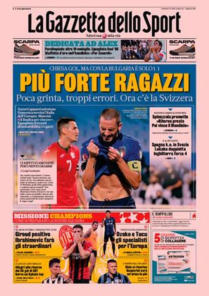 "Più forte ragazzi". Titola così la Prima Pagina dell'edizione odierna de "La Gazzetta dello Sport". "Poca grinta, troppi errori. Ora c'è la Svizzera. Spinazzola promette: 'Ritorno presto. Poi vinco il Mondiale'". E ancora: "Giroud positivo. Ibrahimovic farà gli straordinari. Dzeko e Tucu gli specialisti per l'Europa". E infine: "Allegri alla ricerca dei 36 gol di CR7. Serve un Dybala top".
