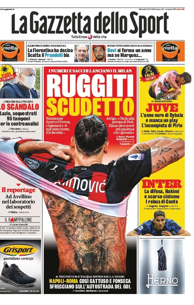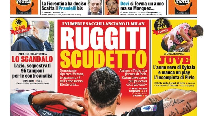 Apre così la prima pagina dell’edizione odierna de ‘La Gazzetta dello Sport’, oggi in edicola. “I numeri e Sacchi lanciano il Milan. Nonostante il pari col Verona, i rossoneri a +8 sull’anno scorso. Napoli-Roma, così Gattuso e Fonseca sfrecciano sull’autostrada del gol”. E ancora: “Juve, l’anno nero di Dybala e manca un play. L’incompiuto di Pirlo. Inter: la difesa, Hakimi e scarso cinismo. I rebus di Conte”. Poi, spazio allo scandalo Lazio: “Sequestrati 95 tamponi per la controanalisi”. Infine, in taglio alto: “La Fiorentina ha deciso, scatta il Prandelli bis. Iachini primo esonero stagionale in A”.