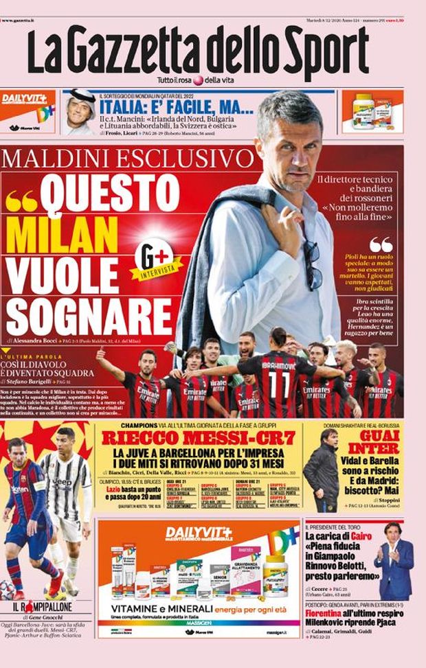 Prima Pagina, La Gazzetta dello Sport: “Questo Milan vuole sognare. Riecco Messi-CR7”